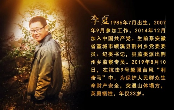 影片中,李夏同志生前是安徽省宣城市績(jī)溪縣荊州鄉(xiāng)黨委委員、紀(jì)委書記,縣監(jiān)委派出荊州鄉(xiāng)監(jiān)察專員。他堅(jiān)定理想信念、堅(jiān)守初心使命,十余年來(lái),始終奮戰(zhàn)在脫貧攻堅(jiān)、鄉(xiāng)村振興、正風(fēng)肅紀(jì)第一線。他堅(jiān)持原則、一身正氣,在紀(jì)檢監(jiān)察工作崗位上,敢于較真碰硬,鐵面執(zhí)紀(jì)執(zhí)法,突出整治群眾身邊腐敗和作風(fēng)問(wèn)題,推動(dòng)全面從嚴(yán)治黨不斷向基層延伸。2019年8月10日,在抗擊臺(tái)風(fēng)利奇馬時(shí)以身殉職,年僅33歲。