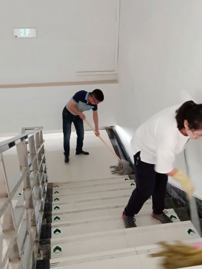 主站樓部分是攻堅(jiān)之戰(zhàn),30位員工在透明的頂棚下感受悶熱灼曬、揮汗如雨,每一塊地磚都是經(jīng)過(guò)了水沖、塵推、除塵、清洗、抹凈、擦干等六道工序,方可達(dá)標(biāo)。上下兩層共26912平方米,經(jīng)過(guò)兩天半的時(shí)間終于完工,看著光亮如新、纖塵不染的候車(chē)廳,所有員工的臉上都綻放了發(fā)自?xún)?nèi)心的微笑。