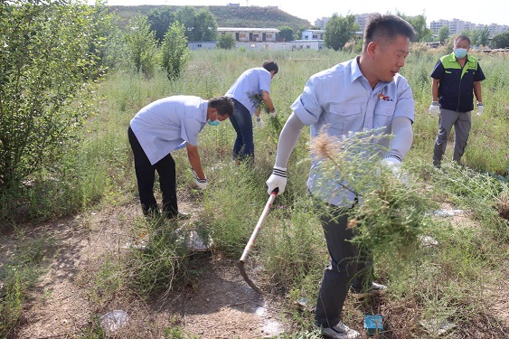 活動(dòng)現(xiàn)場,黨支部書記娜仁、經(jīng)理史濤帶領(lǐng)大家在各自的責(zé)任區(qū)域內(nèi)分片作業(yè)。大家在炎炎烈日下,揮汗如雨、干勁十足,有的拔除蒿草、有的收集清運(yùn)……經(jīng)過一下午地辛勤作業(yè),小區(qū)及周邊的蒿草不見了,空氣清新了,環(huán)境也變美了。